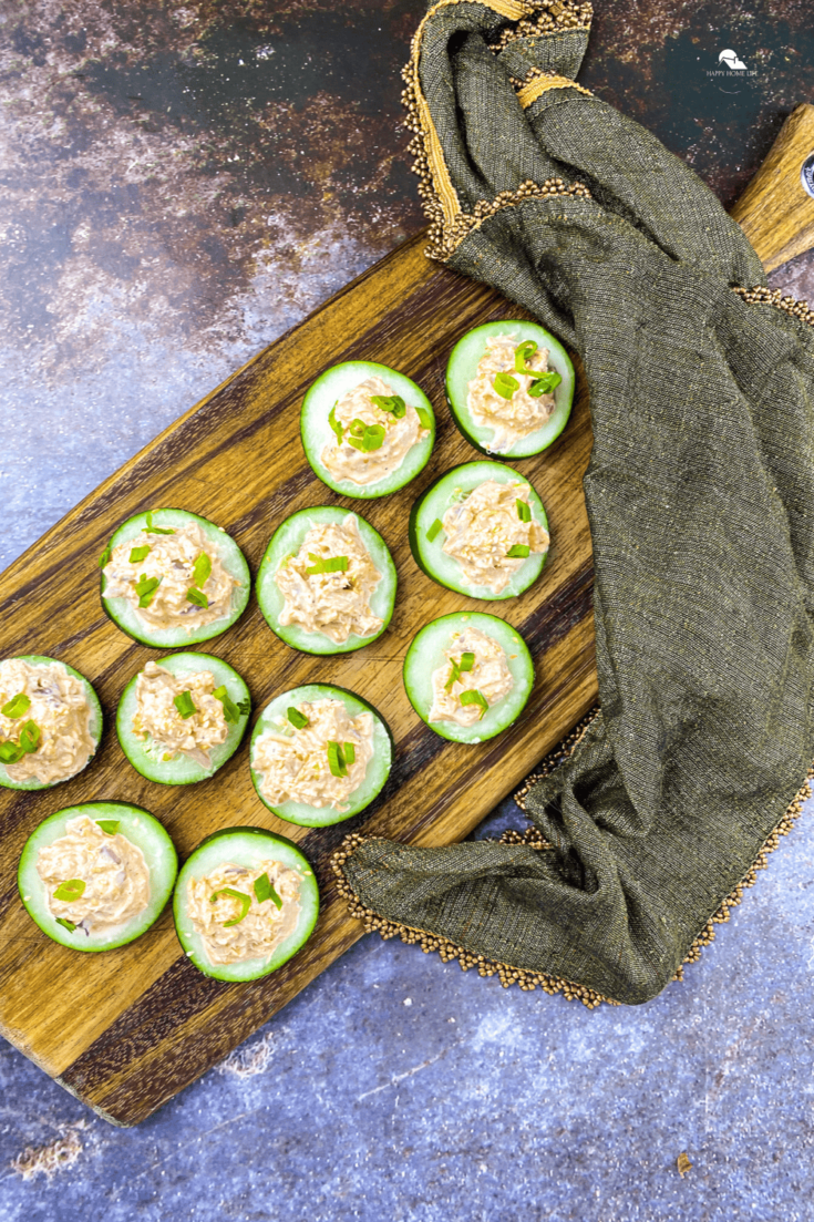 - Then, arrange the tuna mixture between the cucumber slices on a serving platter. Lastly, garnish each appetizer with some of the sliced green onion and sesame seeds right before serving. Enjoy!